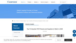 Canroon Product Portfolio: CV900S Series Solar Pump Inverter (dedicated solar pumping solution); CV800D Series Compact Multi-Function VFD; CV900N Series High Performance Vector Drive; CV900G Series General Purpose Vector Inverter; CV800 Series Multi-Function Inverter; CV900A Series PMSM Drive (Permanent Magnet Synchronous Motor control); CR600 Series VFD (features real-time monitoring, predictive …